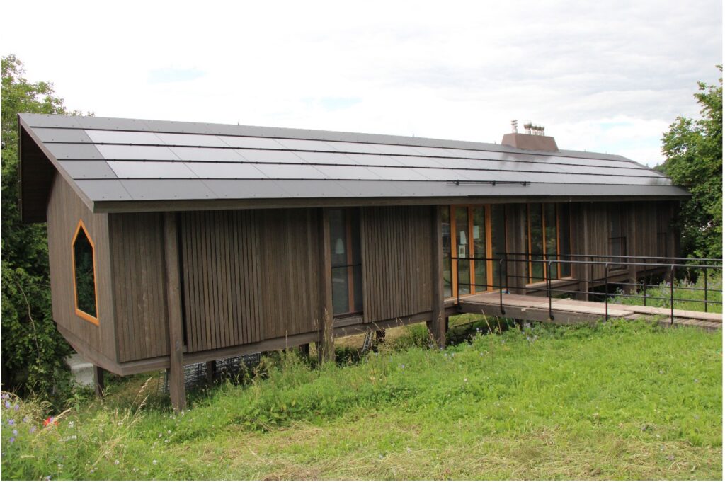 Les ferme (structure porteuses) de cette construction repose sur des pieux qui sont eux même visser dans le sol, pour avoir un impacte minime sur le terrain.